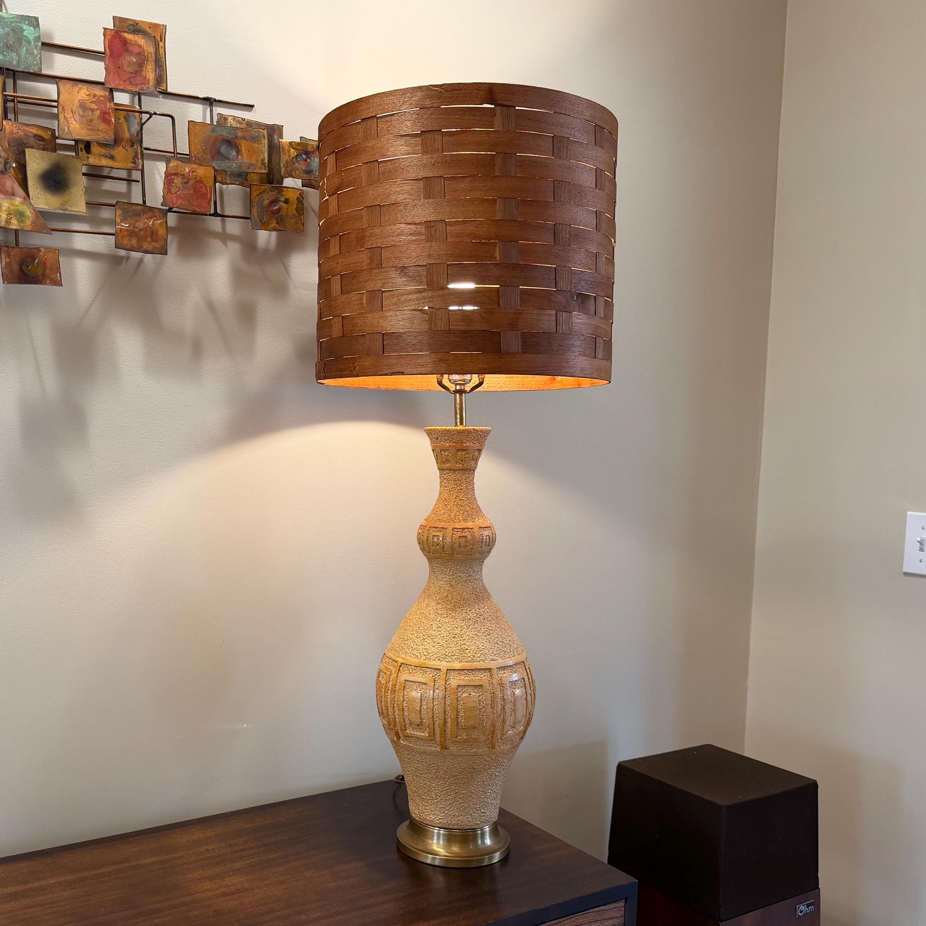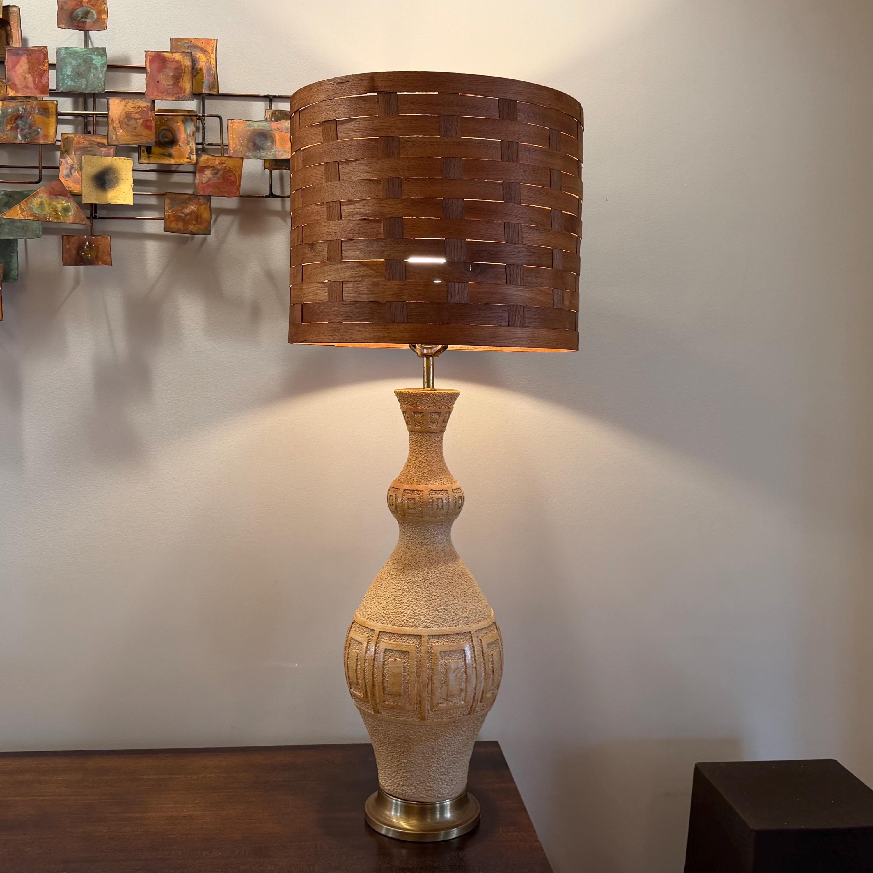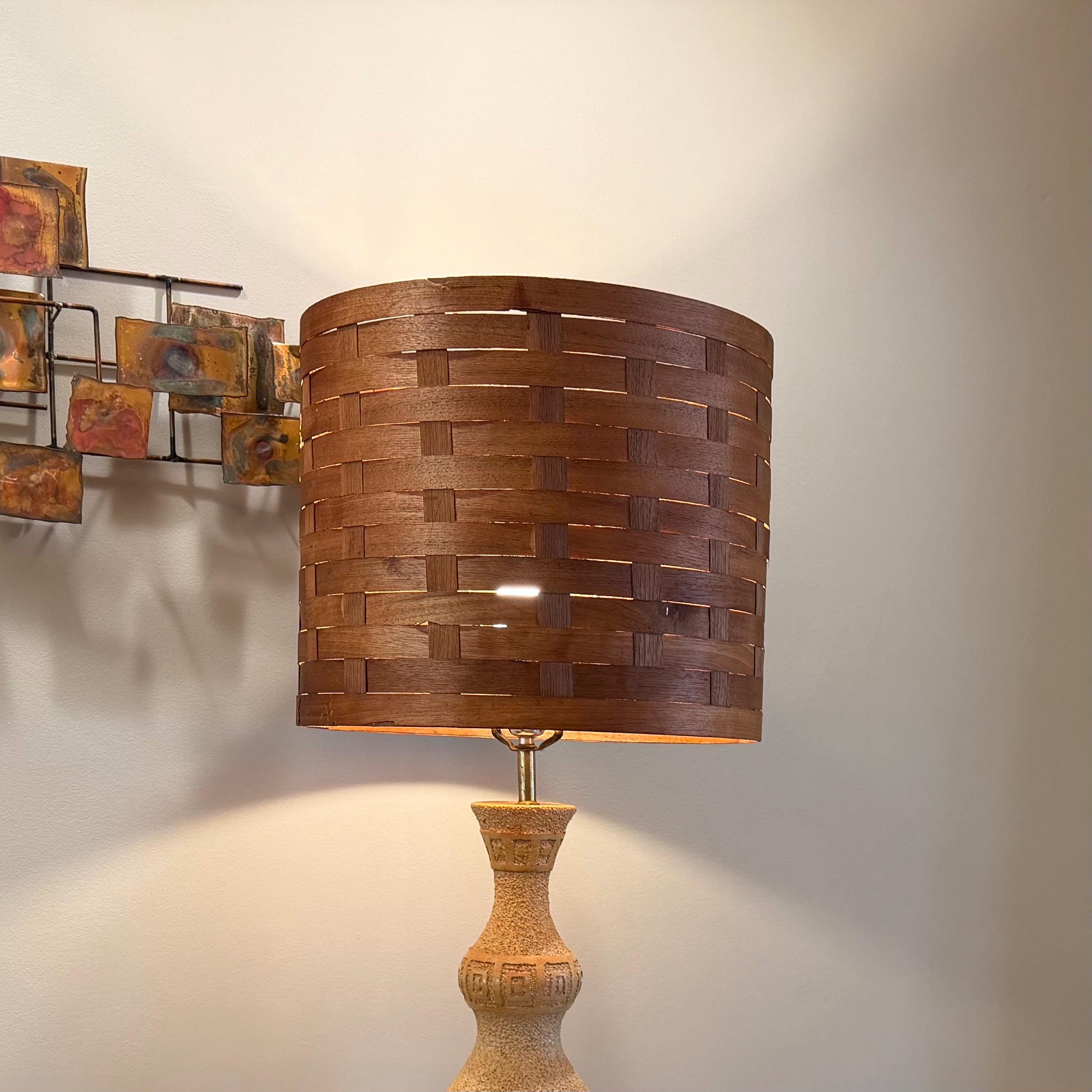 Ceramic table lamp, Teak lamp shade, MCM lighting, 1960s lamp, vintage ceramic, woven wood shade, brutalist lamp, large table lamp, mid century decor, textured pottery