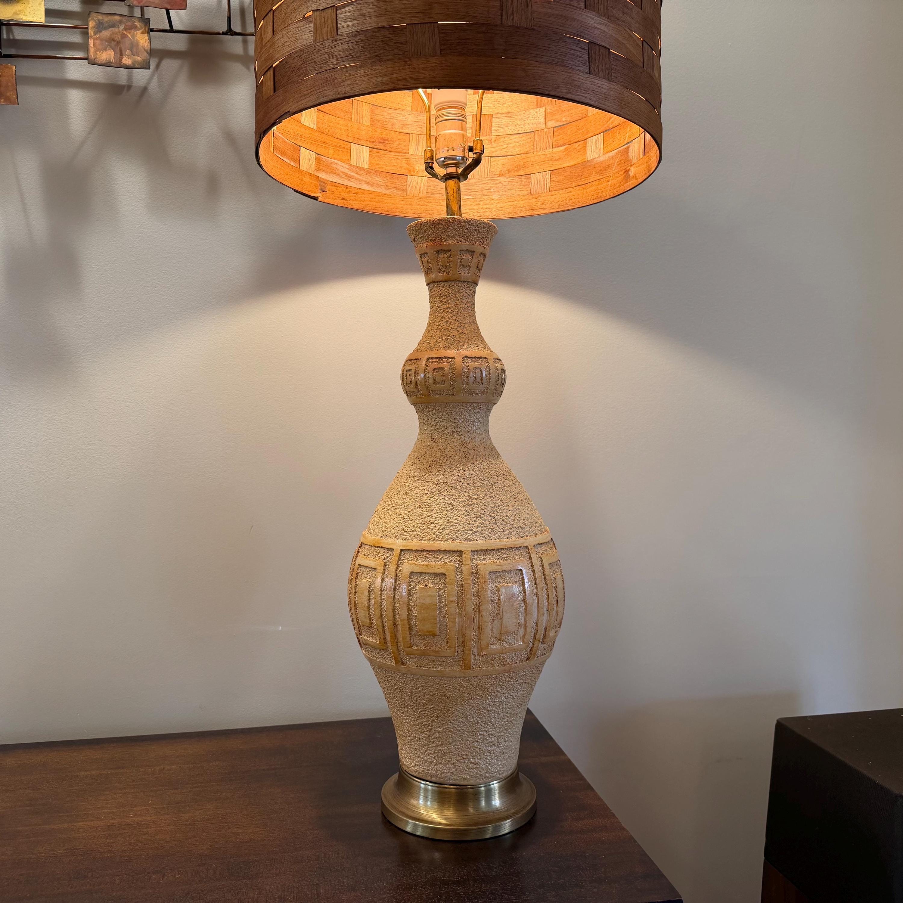 This large 1960s table lamp features a textured ceramic body with a geometric relief pattern and a brass-finished base. It is paired with a woven teak wood slat shade that creates a warm, diffuse light. The neutral tones and natural materials are characteristic of Mid Century Modern design.
